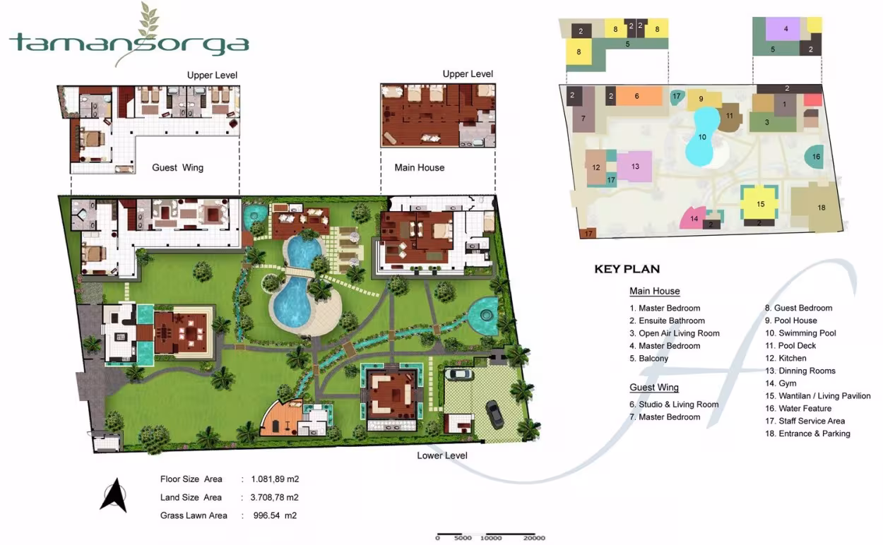 Ubicada en un terreno de 3600 metros cuadrados en un magnífico jardín tropical, Villa Taman Sorga puede alojar hasta 12 huéspedes. Se compone de una casa principal de dos pisos amueblada con antigüedades indonesias, un ala de invitados de dos pisos de estilo contemporáneo, un pabellón de estar tradicional balinés Wantilan, una cocina gourmet de última generación, un comedor interior y exterior, un gimnasio, una casa de piscina y una piscina de forma irregular de 17 metros.